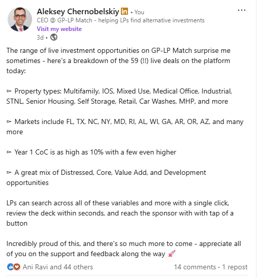 GP-LP Match - a simple (and free) way for you to reach LPs. You can join here in under a minute.